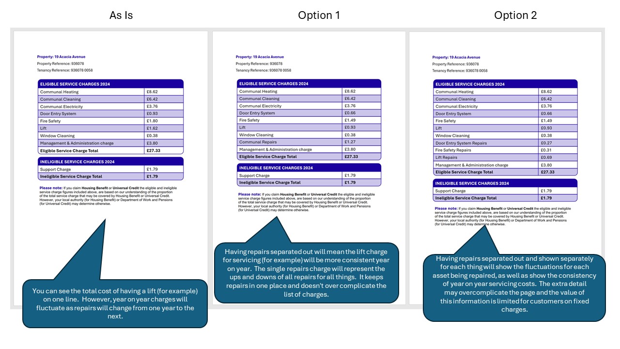 In the example on the document, option one shows all communal repairs together as one charge, however in option two the communal repairs are separated out (in this case into Door entry, fire safety and lift repairs).